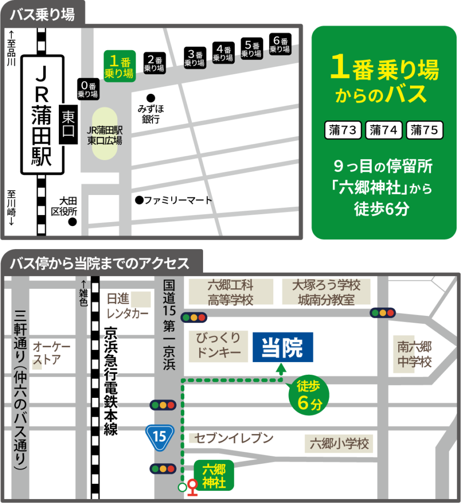 当院へバスでお越しの方は、京浜急行バスの「六郷神社」または「南六郷3丁目」をご利用いただくと便利です。